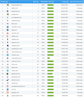 Я недавно наткнулся на интересных списочек от сервиса SEOprofiler — ТОР 100 доменов по количеству обратных ссылок на них (на скриншоте ТОП-30, остальных участинков смотрите на сайте сервиса):